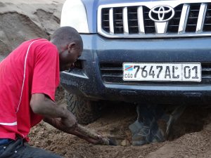 19 Our driver, Reagan Matu, digging the engine protection plate that is broken. This happen after having already broken two tires and the assisted direction of the steering wheel