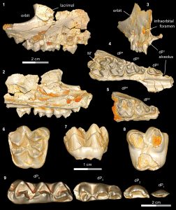 Bothriogenys fraasi : 1-4, right partial maxilla of DPC 5167 with dP2-M1, in (1) lateral, (2) medial, (3) anterior, and (4) occlusal views; 5, right partial maxilla of DPC 20439 (http://doi.org/10.17602/M2/M12647) with dP3- dP4, in occlusal view; 6-8, right dP4 of DPC 3224 (http://doi.org/10.17602/M2/M12690), in (6) occlusal, (7) lingual, (8) ventral views; 9, DPC 11416 (http://doi.org/10.17602/M2/M12641) with dP1- dP4, in occlusal view.