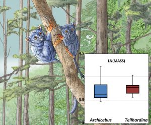 Body mass (in natural log) of early Eocene Chinese Archicebus and Belgian Teilhardina from conventional ordinary least squares regression models. The drawing illustrates the reconstruction of Teilhardina from Dormaal, Belgium (done by Pascale Golinvaux, RBINS)