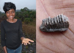 16 Nicole Kitambala Yaya (CRGM) showing a fossil Myliobatis ray tooth just discovered