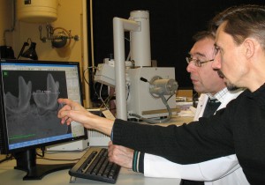 08 Thierry Smith (front) and technician Julien Cillis (back) taking SEM pictures and measurements of a small Paleocene mammal jaw with a Scanning Electron Microscope